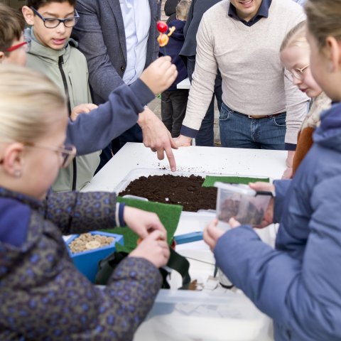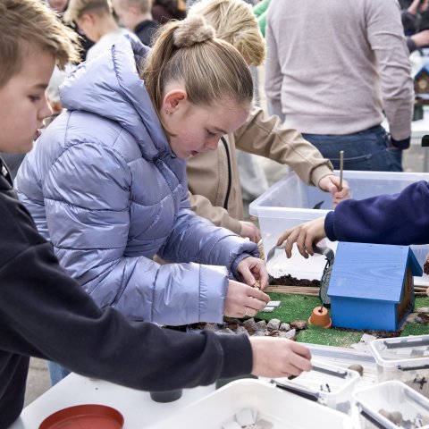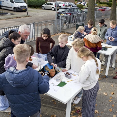 Na de quiz gingen de leerlingen naar buiten om hun eigen klimaatadaptieve tuintjes te maken. Met materialen zoals zand, tuinschors, schelpen, stenen en bladeren ontdekten ze hoe je regenwater kunt opvangen, droogte voorkomt en ruimte maakt voor meer groen en biodiversiteit. De resultaten waren creatief, doordacht en vooral met veel plezier gemaakt.